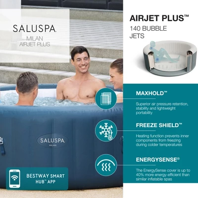 - SALUSPA AIRJET HOT TUB: Round Milan hot tub provides a soothing massage experience with 140 bubbling warm jets for up to 4 to 6 people and reaches up to 104 degrees Fahrenheit for ultimate relaxation