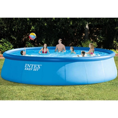 Stay cool and splash away with the Intex Easy Set Inflatable Swimming Pool. This air-filled pool will be a great escape for you and your family, especially on a scorching summer day. The round above-ground pool is easy to set up and sits nicely on any outside solid surface. Simply inflate the pool and watch friends and family swim, splash, or relax the day away. Measuring 18 feet in diameter and 48 inches tall, this pool is made to accommodate up to 8 people at a time. This backyard swimming pool provides the utmost durability by being constructed with 3-ply materials that resist puncture, ensuring that it will stand up to everyday use. During the off-season, simply deflate the pool for a hassle-free clean and storage experience. Plus, the included filter also makes for additional easy maintenance while the ladder, ground cover, and debris cover ensure you have everything you need for the perfect outdoor day. Bring water-filled joy to your friends and family this summer with the Intex Easy Set Swimming Pool. Disclaimer: Please review your HOA rules and restrictions before purchasing this product. Not all housing agencies permit private above-ground pools.