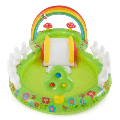 Enjoy some fun in the sun with the Intex My Garden Play Center. This playset features a water-filled fun environment that all your kiddos will enjoy. Included with the center are 2 mushrooms, 4 butterflies, and 3 balls along with a single slide. You can attach a garden hose to the built-in sprayer so your kids can enjoy a refreshing ride down the slide. After inflating the mat when setting the play center up, simply use a garden hose to fill the playset as the multi-activity structure can hold up to 119 gallons of water.Whether it’s your backyard or front yard, this portable set can be a good fit anywhere. Plus, measuring only 114 inches long and 71 inches wide, the play center doesn’t take up much room at all so your children can still run around freely in the yard. The water playset also displays a beautiful flower-patterned design that provides an extra layer to the already fun-filled environment.Stay cool this summer with the Intex My Garden Play Center.