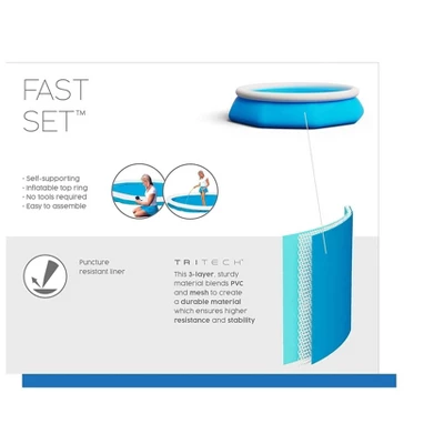 Stay cool this summer with our 10 foot inflatable easy set swimming pool. Good times are here with this spacious, fun, inflatable pool that is big enough for the whole family to enjoy. The comfortable blue and white wide sidewalls allow for ultimate lounging to make your summer experience unforgettable. This will become a quick, backyard favorite all summer long.Product Features: Inflatable top ring swimming poolColor: blue and whitePuncture resistant linerExtra strong Tri-Tech sidewalls made with 3 layers of PVC and mesh create a durable material ensuring higher resistance and stabilitySelf-supporting inflatable top ringEasy to set up, only takes 10 minutes of assemblySimply inflate the upper ring and the pool will rise as it’s filled with waterFeatures a built-in drain valveCompact storage easy deflationIncludes pool filter pumpThe filter pump will keep your pool clean from debris by having a flow rate of 330 gallons per hourAir release valve for air trapped inside filter chamberFor outdoor use onlySuitable for ages 6 and upCover and ladder are not includedDimensions: 30″ high x 10′ diameterMaterial(s): PVC