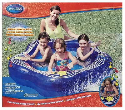 SplashFX Ocean Band Pool by Swimways, offers a patented, SplashFX technology that replaces wires with water-friendly ink. Dolphin leads the Band! Blowfish bellows on the Sax. Stars dances across the Keyboard. Crab keeps time on the Drums. Trurtle strums the Guitar. Let your child be part of the band by letting them touch the pool to make the band play! The color-printed graphics on your SplashFX Ocean Band pool creates sounds. Experiment with different instruments and sound combinations. For best results, have your child use their whole and/or gently rub thr graphics with her fingertips. Measures 15′ x 56′ x 15′.