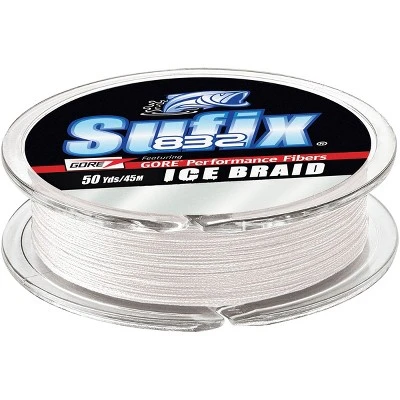 The Sufix 50 Yard 832 Ice Braid Fishing Line is the strongest, most durable small diameter ice braid. R8 precision braiding and fiber technology provides superior strength, roundness and line consistency. Patent-pending construction of 8 fibers (7 Dyneema plus 1 GORE Performance Fiber) and 32 weaves (pics) per inch. GORE Performance Fibers add incredible fray and abrasion resistance for unmatched durability. Dyneema fibers provide high strength and sensitivity. The small diameter and hydrophobic water-repellent protection resists freezing. Capacity: 50 yards. Color: Ghost.